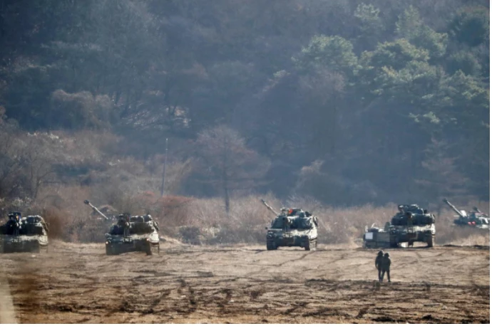 Pháo tự hành K-55 của Hàn Quốc tham gia vào cuộc tập trận gần khu vực phi quân sự ở Paju, Hàn Quốc ngày 29-11-2017. Ảnh: REUTERS