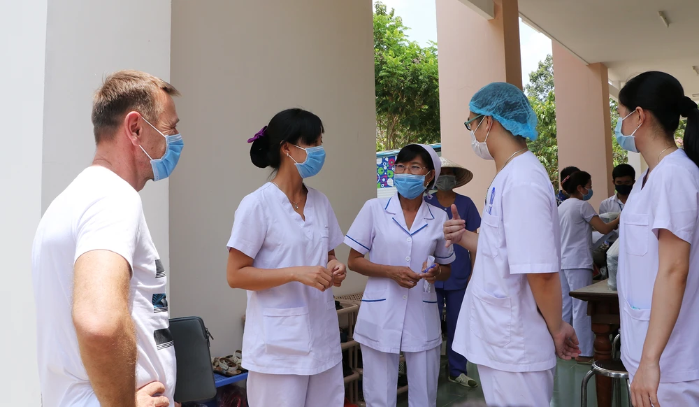 Trưa 30-3, thêm ba bệnh nhân, trong đó có một người nước ngoài được công bố khỏi bệnh. Họ được cấp giấy xuất viện và nhận những lời chúc, tình cảm tốt đẹp của các y bác sĩ. Đáp lại là những lời cảm ơn chân thành. Một người cho biết những ngày được điều trị ở bệnh viện dã chiến cảm thấy ở đây thật thân thương, như trong một gia đình. Ảnh: NT