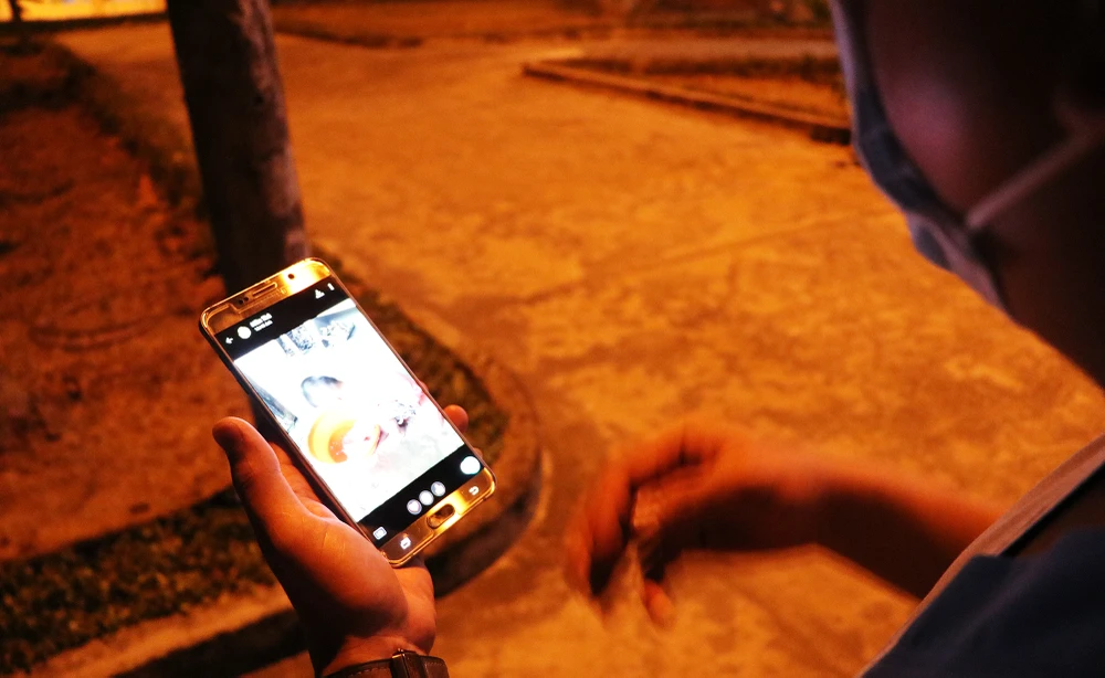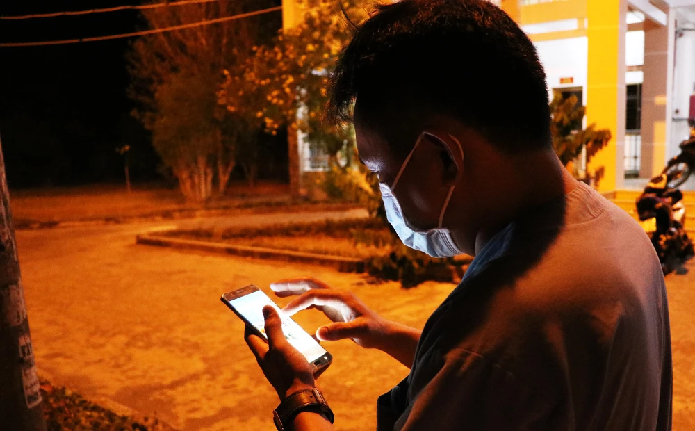 Trong đêm, y sĩ Trần Trọng Hiếu, y sĩ Bệnh viện huyện Củ Chi, cầm điện thoại gọi về cho gia đình. Một tháng nay anh không về nhà và bám trụ ở Bệnh viện dã chiến thực hiện chuyên môn của mình. Ảnh: NT