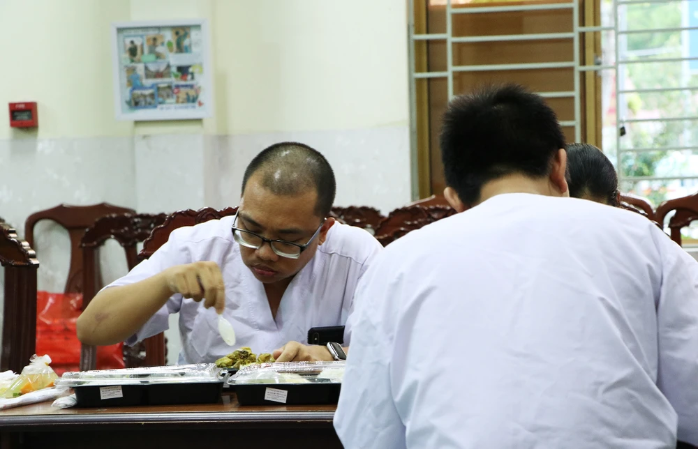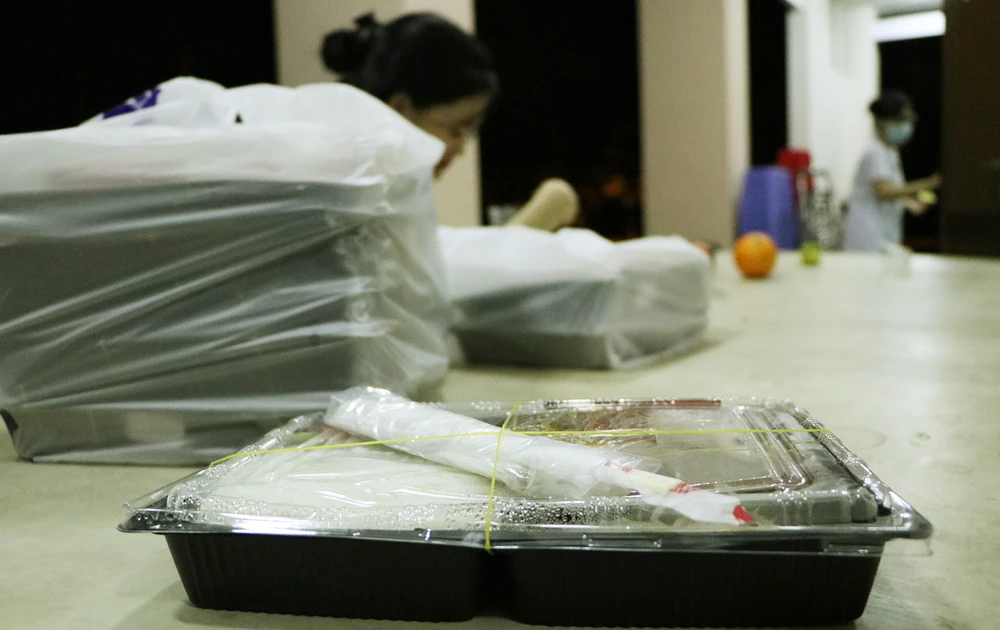 Nhiều y bác sĩ vội vã ăn bữa cơm khi tối dần buông. Họ phần lớn đều là người trẻ, trong số đó không ít người xung phong ra tuyến đầu chống dịch bệnh COVID-19. Ảnh: NT