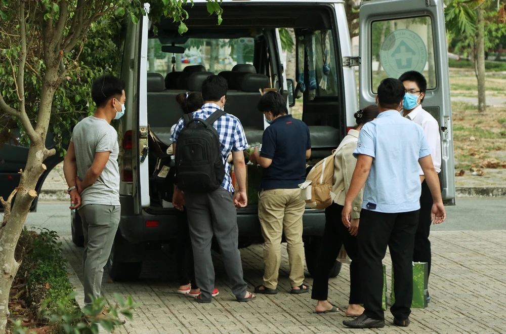 Trong lúc đó, một xe chở các cán bộ nhân viên y tế tới thay phiên, một số sẽ trở về nhà hoặc bệnh viện nơi làm việc. Tất cả mọi người cho biết sẽ có ý thức cách ly để đảm bảo sức khỏe cho gia đình và cộng đồng. Ảnh: NT