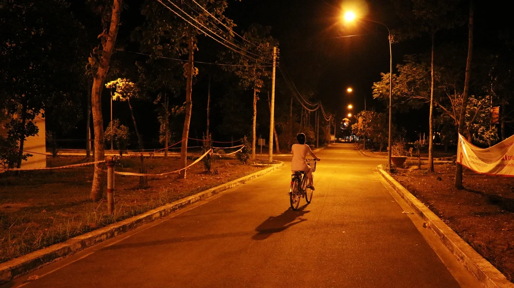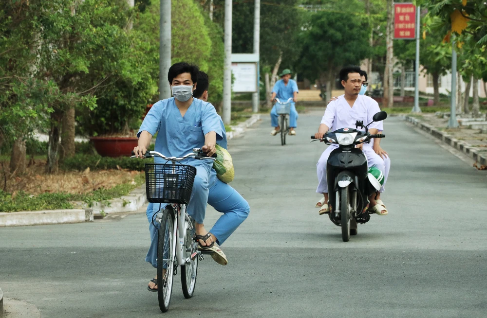 Vào buổi sáng sớm, các y bác sĩ dùng các phương tiện như xe đạp để tiện di chuyển trong khuôn viên bệnh viện dã chiến. Ảnh: NT