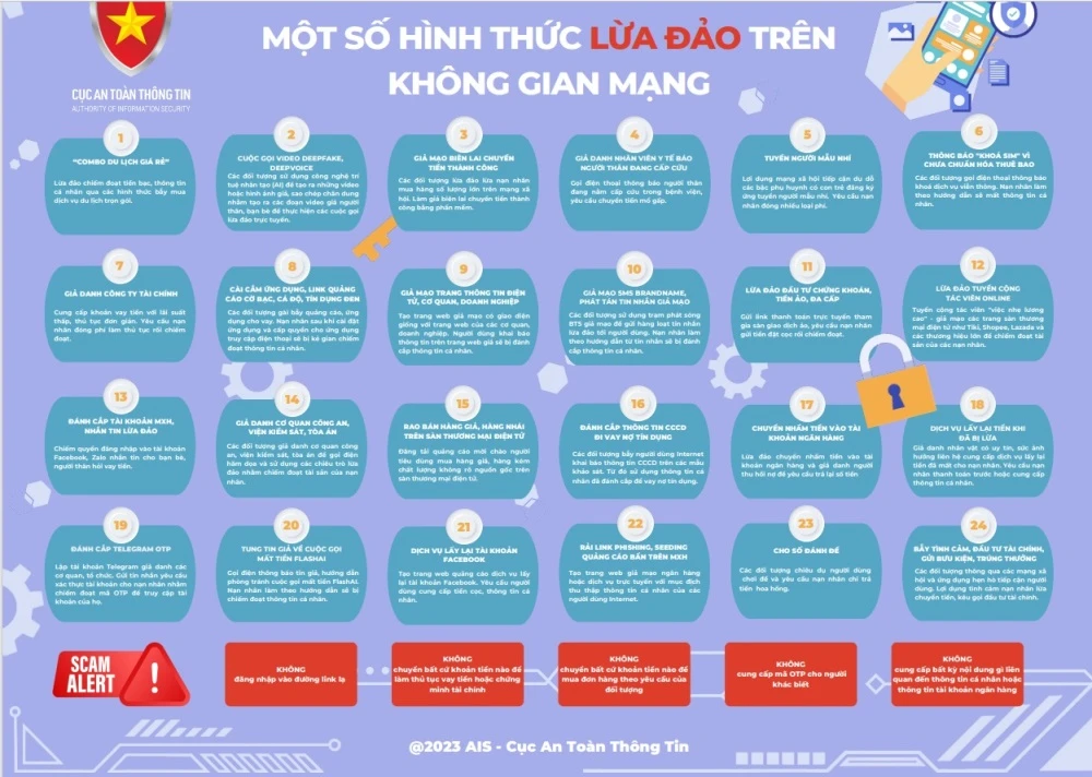 Có ba nhóm lừa đảo chính (giả mạo thương hiệu, chiếm đoạt tài khoản và các hình thức kết hợp khác) với 24 hình thức lừa đảo đang diễn ra trên không gian mạng Việt Nam.