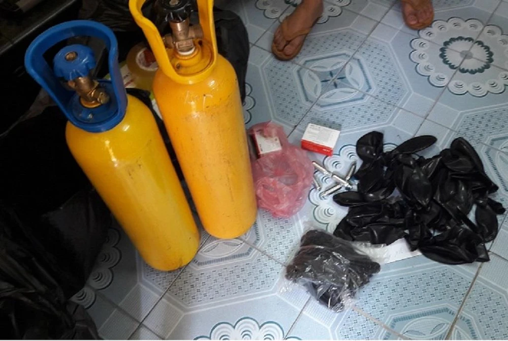 Riêng tại phòng 302, 11 nam nữ vẫn đang “phê pha”. Cảnh sát phát hiện hai túi nilon chứa các chất kết tinh màu trắng, hàng chục vỏ bóng cười chưa qua sử dụng cùng ba bình chứa khí cười và nhiều vật chứng liên quan.