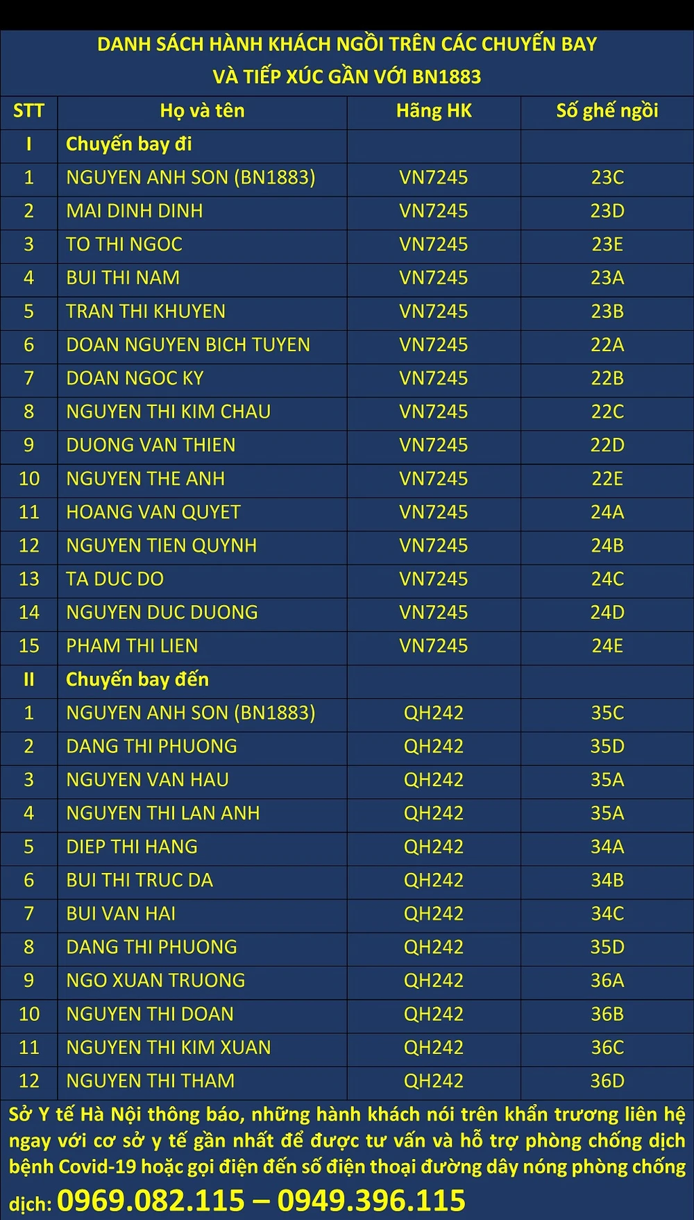Các hành khách này di chuyển trên hai chuyến bay VN7245 từ Hà Nội đi TP.HCM (lúc 6 giờ ngày 29-1) và QH242 từ TP.HCM đi Hà Nội (lúc 21 giờ 55 ngày 29-1). Đây là hai chuyến bay mà BN 1883 từng ngồi từ Hà Nội vào TP.HCM và ngược lại.