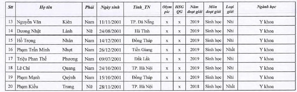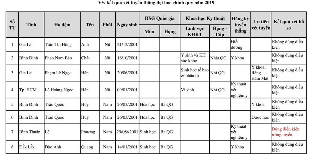 Kết quả xét tuyển thẳng như sau: