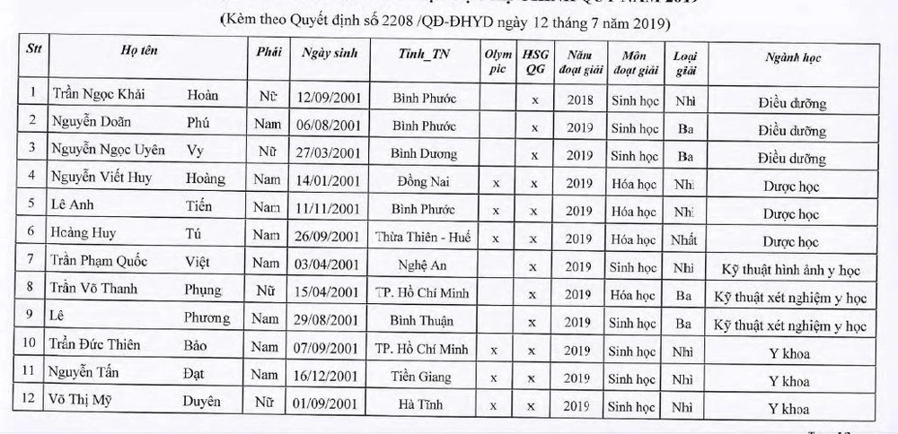 Trường ĐH Y dược TP.HCM vừa thông báo kết quả xét tuyển thẳng vào học đại học hệ chính quy của trường năm 2019 theo quy chế của Bộ GD&ĐT.