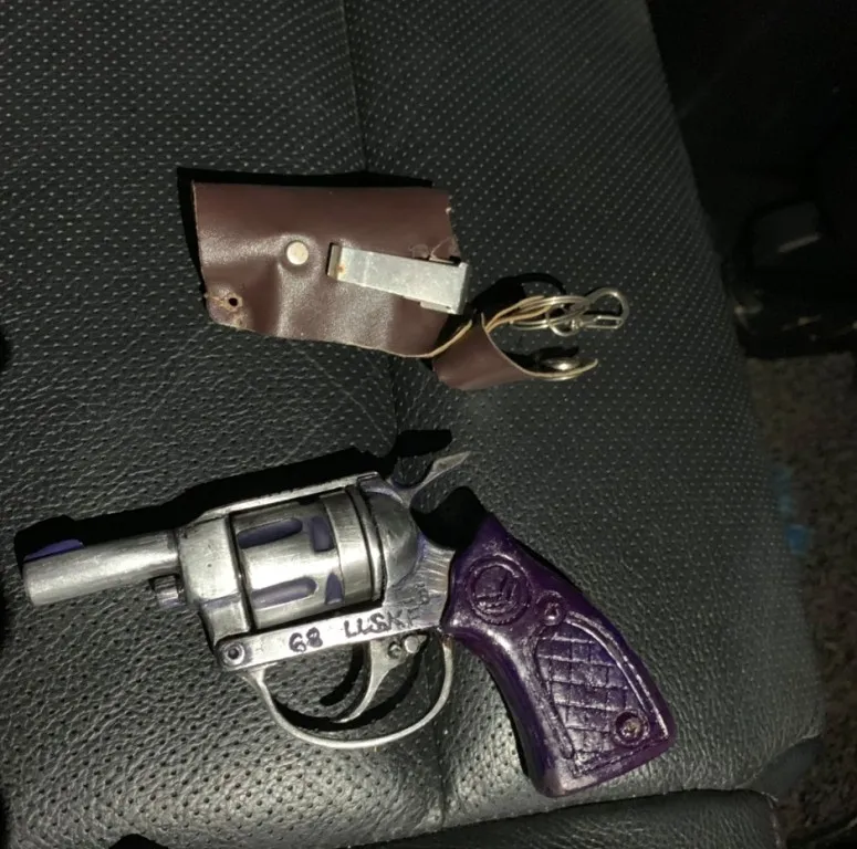 Lưu Phi Long cùng tang vật tại hiện trường. Trong xe của người này có một khẩu súng rulo, 5 viên đạn và 2 con dao tự chế để phòng thân. Ảnh: CACC