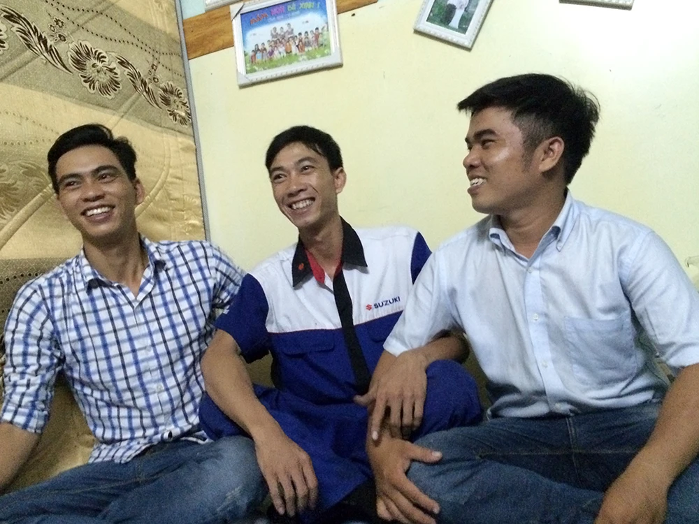 Xóm trọ nhỏ sôi động hẳn. Căn phòng nhỏ nơi ở của anh Thắng cùng mẹ và vợ chật người, có cả PV cùng đến. Phòng trọ chẳng có gì đáng giá ngoài cái tivi, hai chiếc quạt được bật hết công suất. Trên tường, những mảnh xốp phết kim tuyến ghi rõ nhà anh Thắng thêm thành viên mới là vợ vào tháng 1-2016. Căn phòng chưa đầy 15 m2 giá 1 triệu đồng tiền thuê đó, anh Thắng đã sống cùng mẹ từ năm 2004 đến nay, từ lúc hai mẹ con từ Quảng Ngãi vào TP.HCM.