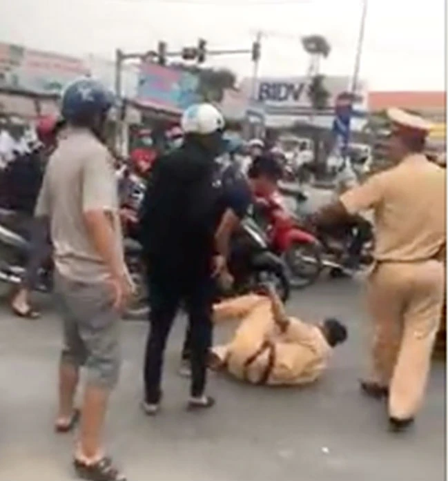 Trung úy CSGT bị tấn công ngã xuống đường.
