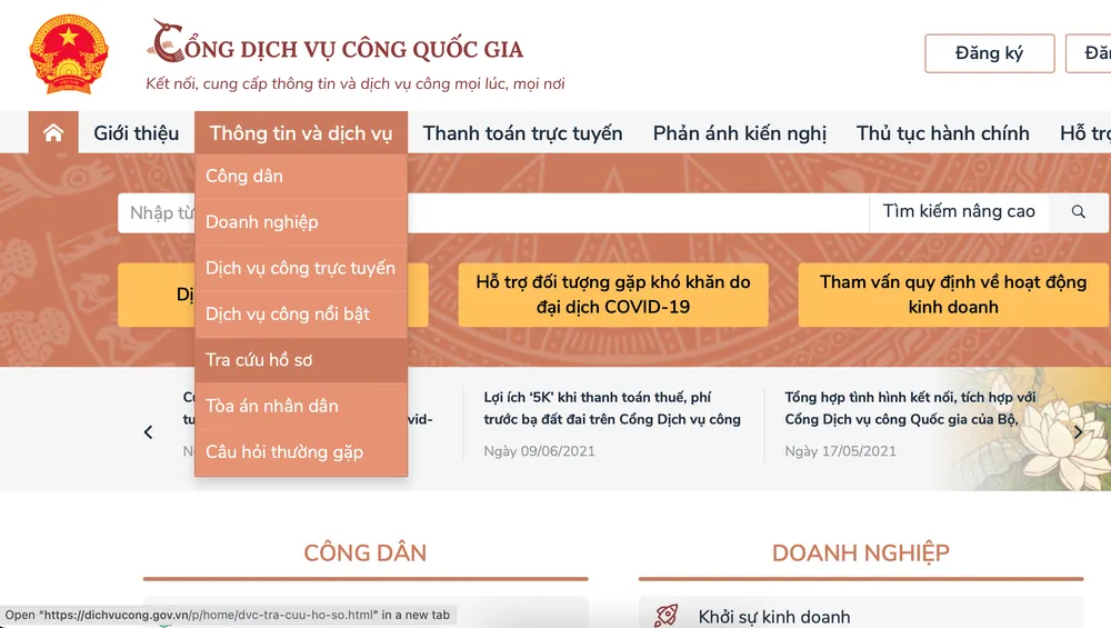 Người dân truy cập vào Cổng dịch công quốc tại địa chỉ https://dichvucong.gov.vn/p/home/dvc-trang-chu.html. Sau đó, nhấp vào mục Thông tin và dịch vụ => Tra cứu hồ sơ.