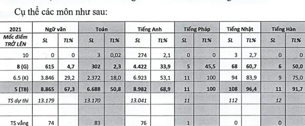 Theo đó, có 67,3% bài thi môn Ngữ văn, 50,8% bài thi môn Toán và 68,9% bài thi Tiếng Anh đạt điểm trung bình trở lên. Có 274 bài thi tiếng Anh đạt điểm 10, môn văn không có điểm tối đa.