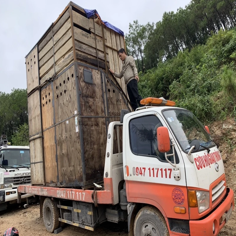 Vấn đề còn lại là làm sao đưa một lúc cả ba con vào thùng, cẩu lên xe tải đưa đi mà không làm cho chúng hoảng sợ và bị chấn thương.