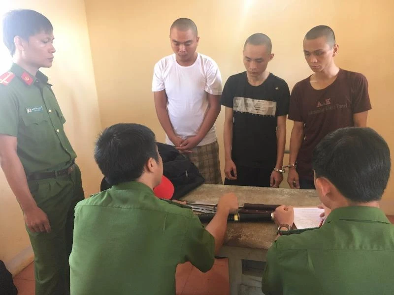 Cơ quan công an làm việc với ba nghi can cùng hung khí gây án.