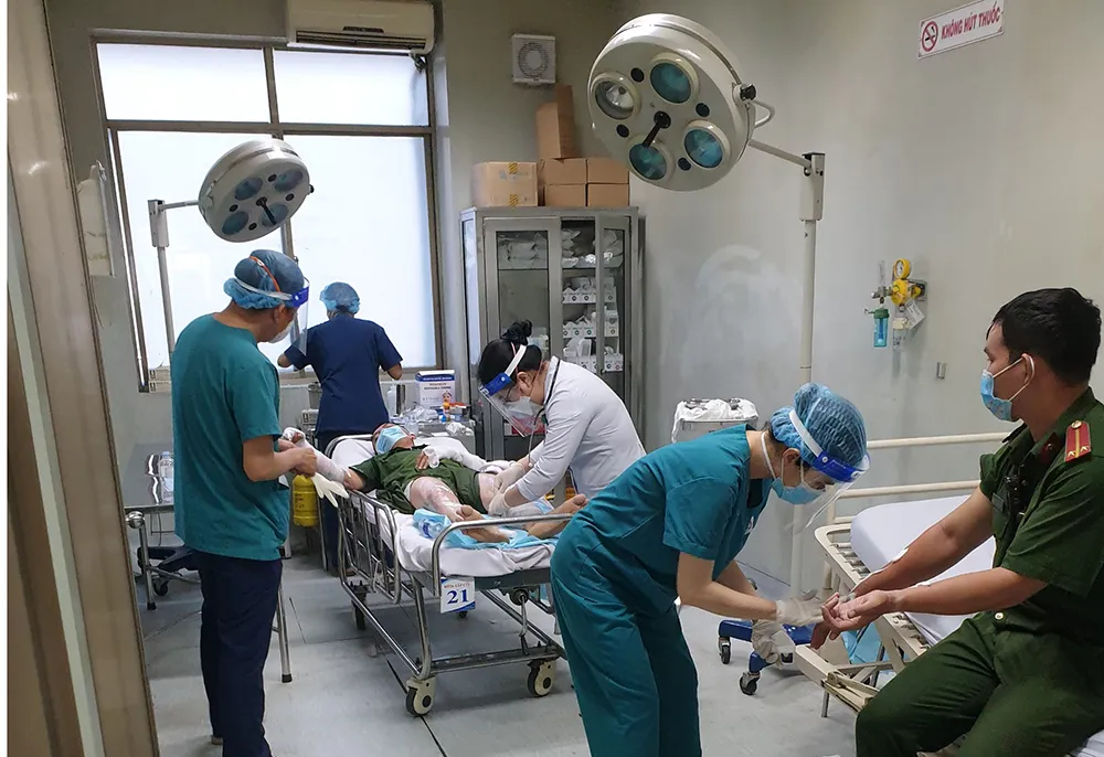 Những công an bị bỏng vì "bom xăng" phải nhập viện cấp cứu. Ảnh: NGUYỄN YÊN