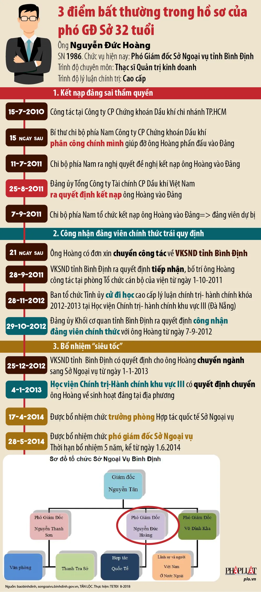 (PLO)- Ban Tổ chức Tỉnh ủy Bình Định vừa báo cáo Thường trực Tỉnh ủy những vi phạm trong quá trình kết nạp Đảng đối với Phó Giám đốc Sở Ngoại vụ tỉnh Bình Định Nguyễn Đức Hoàng. Ông Hoàng được bổ nhiệm vào chức vụ trên năm 28 tuổi và nay ông 32 tuổi.
