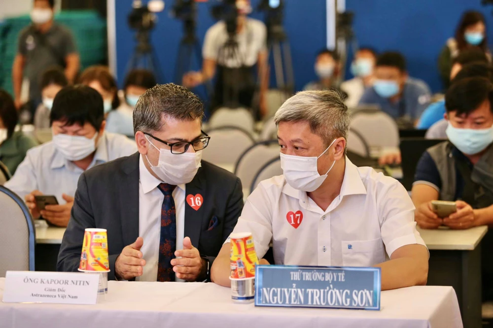 Thứ trưởng Bộ Y tế Nguyễn Trường Sơn trao đổi với giám đốc AstraZeneca. Ảnh: TRƯỜNG GIANG