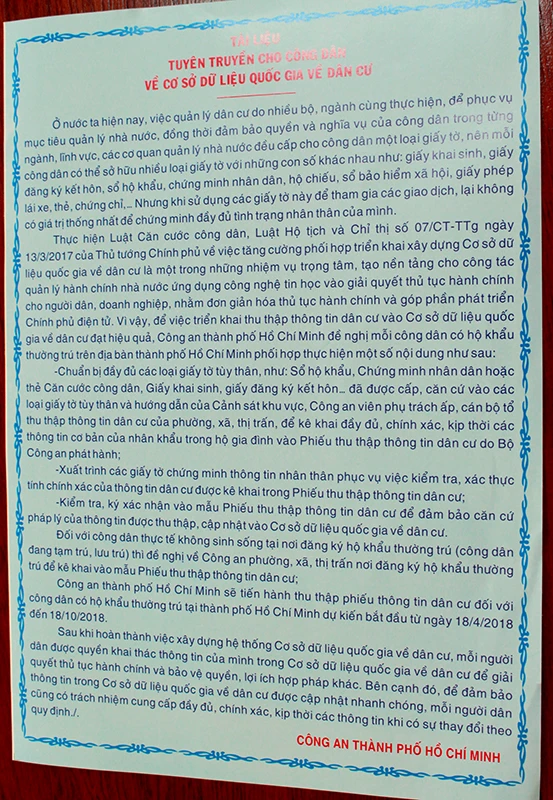 Sáng 12-4, Công an quận Bình Tân cũng cho biết sẽ cho in 80.000 tờ bướm này gửi cho từng hộ dân để bà con nắm bắt thông tin và đồng thuận với chủ trương; đảm bảo thực hiện đúng tiến độ việc thu thập CSDL dân cư.