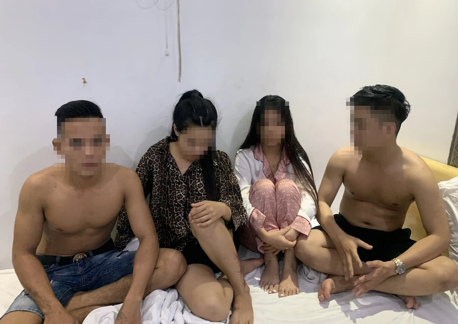 Hai đôi nam nữ sử dụng trái phép chất ma tuý tại phòng 103 nhà nghỉ The Love. Ảnh: CA