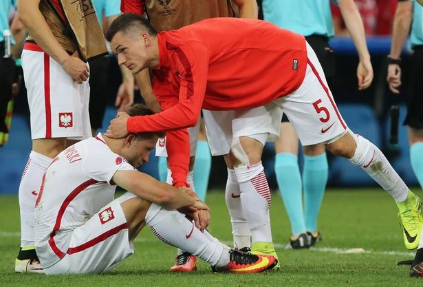Cầu thủ Ba Lan thất vọng sau trận thua Bồ Đào Nhà trên chấm penalty. ẢNH: GETTY