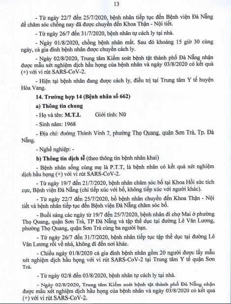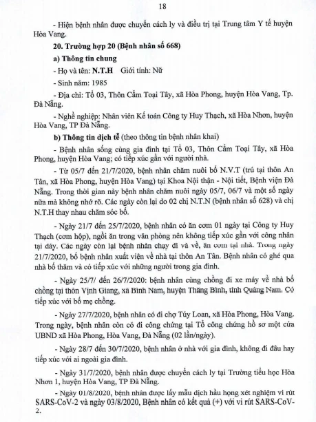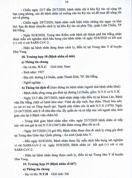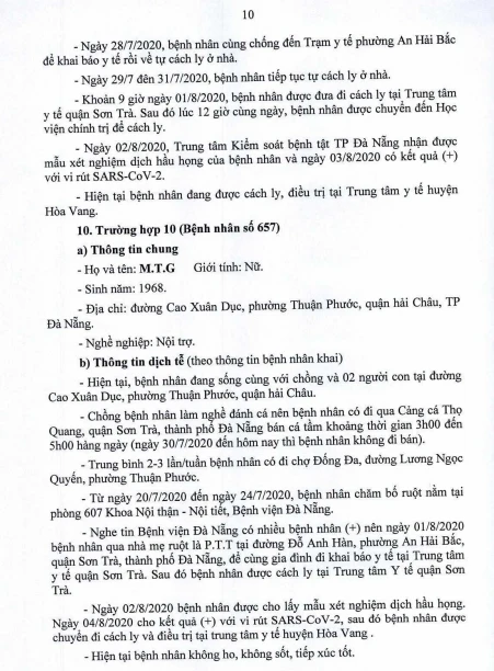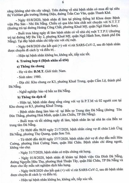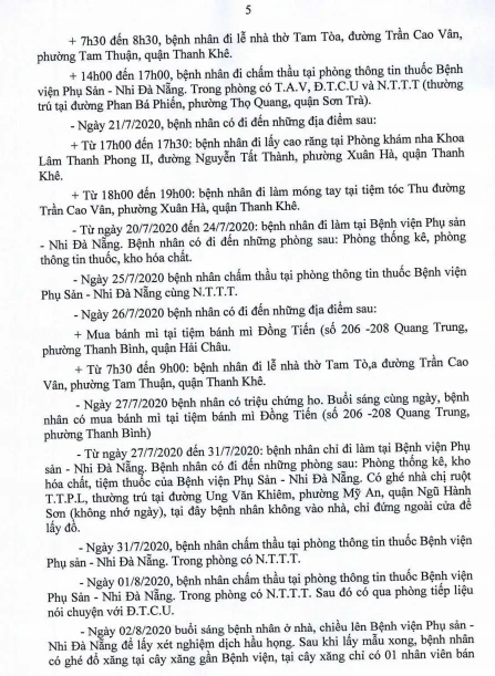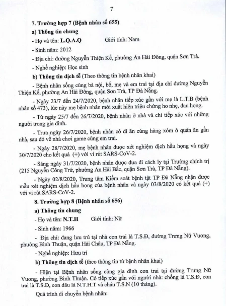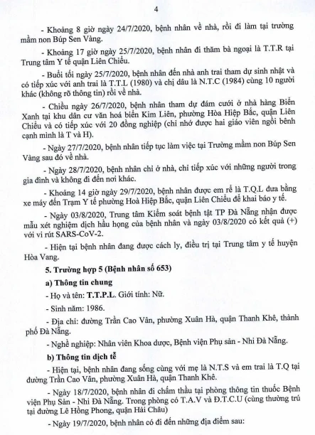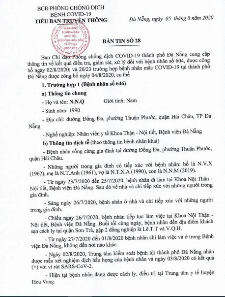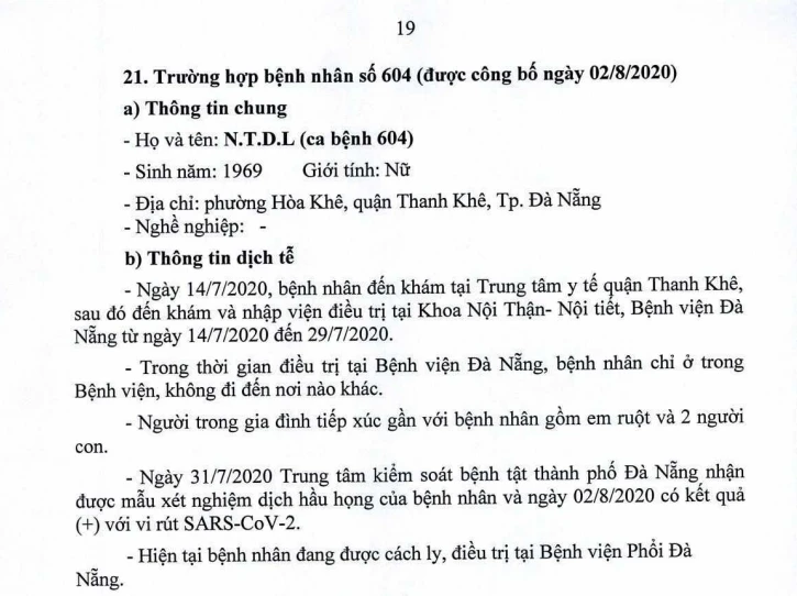 Tối 5-8, Ban chỉ đạo Phòng chống dịch COVID-19 TP Đà Nẵng cung cấp thông tin về kết quả điều tra, giám sát, xử lý đối với Bệnh nhân số 604 được công bố ngày 2-8 và 20/23 bệnh nhân mắc COVID-19 tại TP được công bố ngày 4-8.