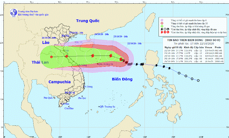 Đến 16 giờ ngày 23-10, vị trí tâm bão ở khoảng 17,7 độ Vĩ Bắc; 114,0 độ Kinh Đông, cách quần đảo Hoàng Sa khoảng 190km về phía Đông Bắc. Sức gió mạnh nhất vùng gần tâm bão mạnh cấp 12 (115-135km/giờ), giật cấp 14.