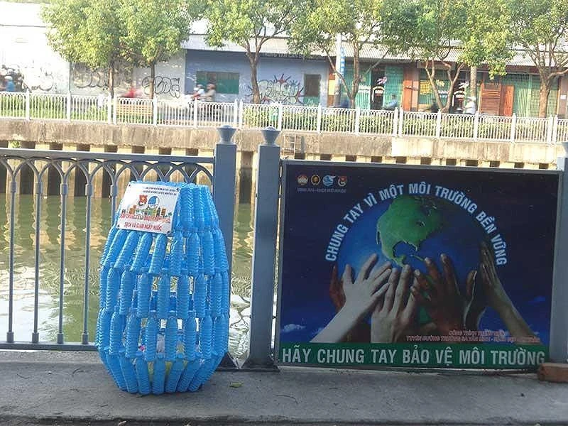 Một thùng rác được làm từ những vỏ chai nhựa đã ra sử dụng được đặt trên kênh Nhiêu Lộc- Thị Nghè.