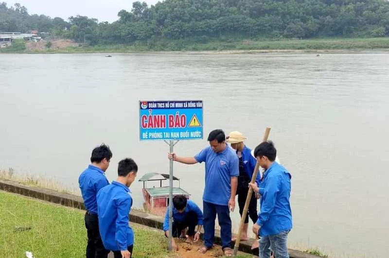 Thanh niên xã Đồng Văn (huyện Thanh Chương, Nghệ An) cắm biển "Cảnh báo đề phòng tai nạn đuối nước" bên sông Lam.