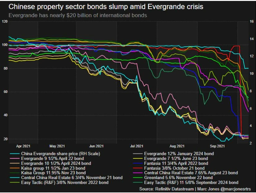 Biểu đồ cho thấy giá cổ phiếu các tập đoàn BĐS TQ trên đà giảm mạnh. Ảnh: REUTERS