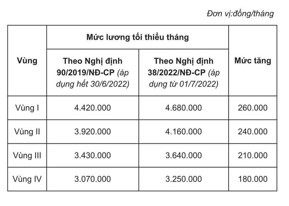 Như vậy mức lương tối thiểu tháng theo Nghị định 38/2022 tăng bình quân 6%, tương ứng tăng 180.000 - 260.000 đồng so với mức lương tối thiểu hiện hành.