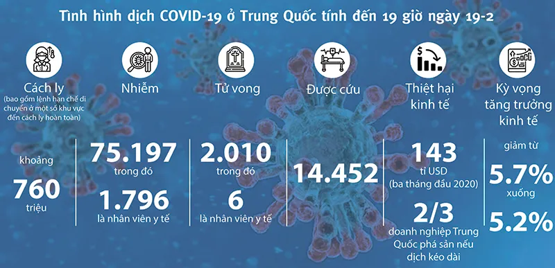 Tờ South China Morning Post dẫn nguồn Ủy ban Y tế quốc gia Trung Quốc (TQ) ghi nhận tính đến 7 giờ tối 19-2 có 2.010 người tử vong vì bệnh viêm đường hô hấp cấp do chủng virus Corona mới (tên chính thức là COVID-19) gây ra, 75.197 ca nhiễm. Như vậy, so với ngày 18-2, số ca tử vong tăng 137 người. Ngoài ra, 1.796 nhân viên y tế cũng được xác nhận lây nhiễm và sáu nhân viên khác thiệt mạng.