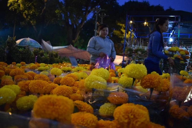 Chị Đỗ Thị Diễm Phương (21 tuổi, Bến Tre) và bạn lên TP.HCM bày hàng từ hôm 24 ngay gần công viên Gia Định (Phú Nhuận). Chị kể chuyện, bán chạy nhất là vạn thọ, tầm 150.000/cặp. Bông chưng Tết do gia đình chị trồng, chăm rồi mang lên Sài Gòn bán, mong có cái Tết đủ đầy hơn.