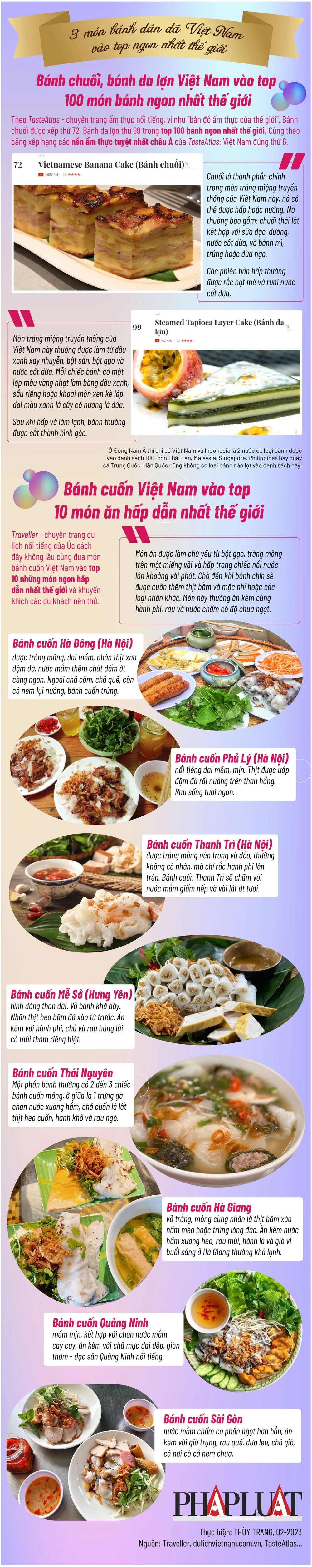 (PLO)- 3 món bánh dân dã Việt Nam vừa vào top ngon nhất thế giới của TasteAtlas và Traveller gồm 2 món bánh ngọt và 1 món bánh mặn. Đặc biệt, đi qua mỗi vùng miền trên dải đất hình chữ S Việt Nam, món ăn mặn này lại ẩn chứa hương vị rất riêng. Đó là bánh chuối, bánh da lợn và bánh cuốn.