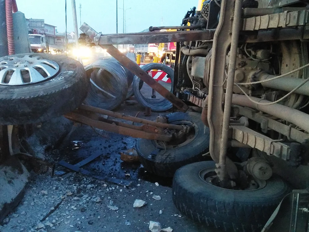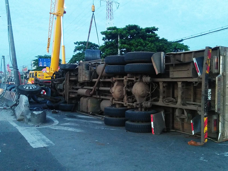 Sự việc khiến chiếc xe lật ngang ra đường, hư hỏng nặng phần đầu, trục bánh trước gãy rời, dầu nhớt cùng hàng hóa sắt cuộn đổ tràn ra ngoài; cột đèn chiếu sáng cũng bị tông gãy.
