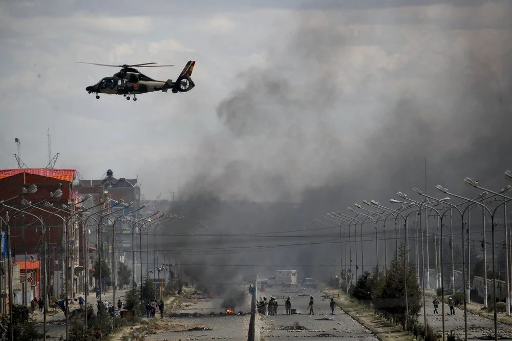 Một chiếc trực thăng của quân đội Bolivia xuất hiện trên một con đường dẫn đến nhà máy nhiên liệu vốn bị người biểu tình phong tỏa. Ảnh: AP