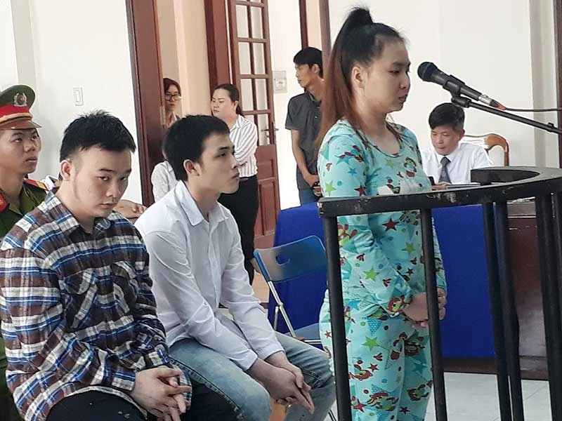 Bị cáo Quyên, Long (phải) và Tâm tại tòa.