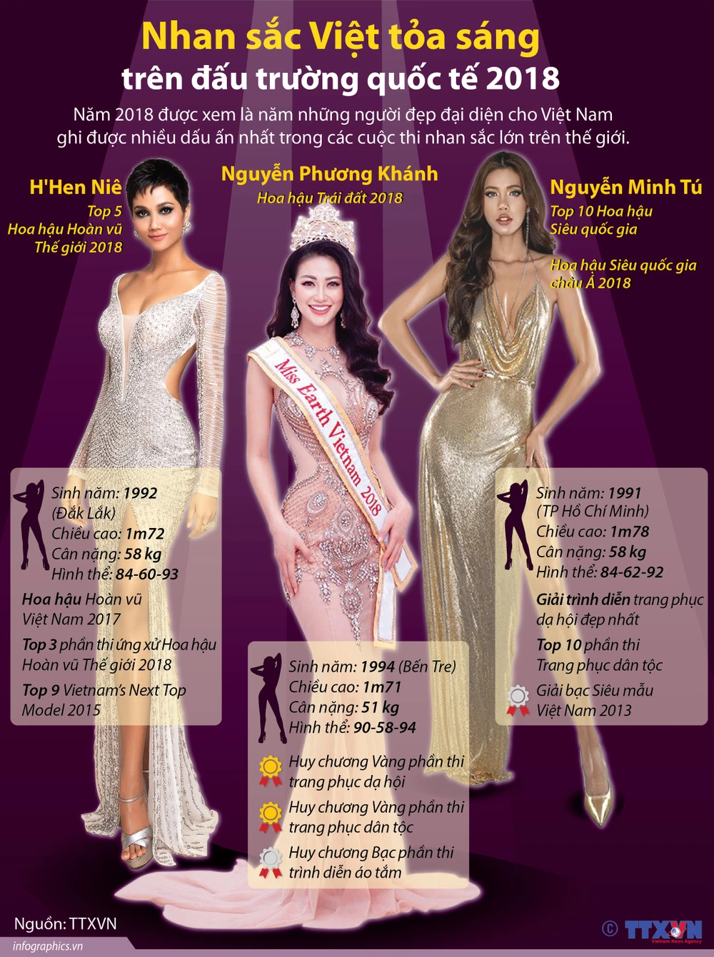 Năm 2018, những người đẹp đại diện cho Việt Nam ghi được nhiều dấu ấn nhất trong các cuộc thi nhan sắc lớn trên thế giới: Top 5 Hoa hậu Hoàn vũ Thế giới, Hoa hậu Trái đất, Top 10 Hoa hậu Siêu quốc gia...