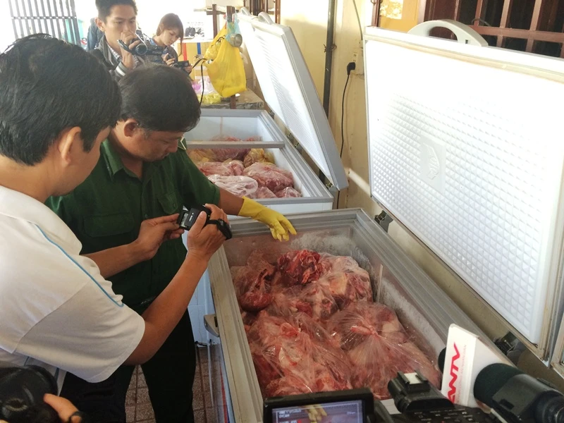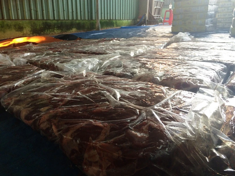 Tại hiện trường, lực lượng chức năng đã lập biên bản và thu giữ gần ba tấn thịt nguyên liệu và thành phẩm gồm: 74 thùng thịt trâu nguyên liệu với trọng lượng 1.332 kg đang rã đông; một tấn thịt đã rã đông và tẩm ướp thành thịt bò, cùng gần 500 kg thịt đã rã đông chuẩn bị tẩm ướp hóa chất.
