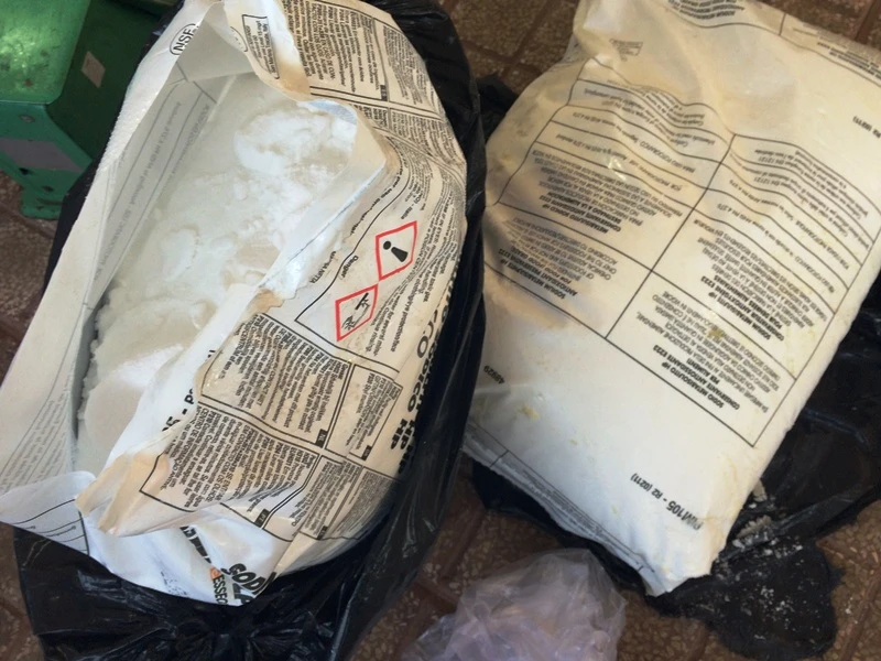 Ngoài ra hai bao hóa chất bột màu trắng nặng gần 50 kg cũng được phát hiện, thu giữ. Bà Thạnh khai mình mua số hóa chất trên ở Chợ Lớn với giá 20.000/kg.