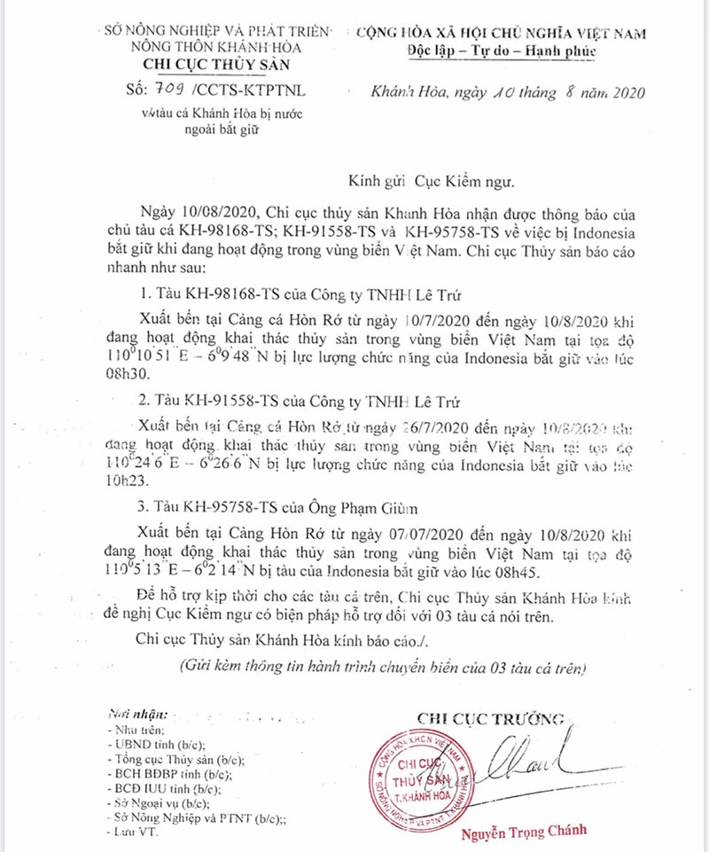 Ngày 10-8, Chi cục Thủy sản thuộc Sở NN&PTNT tỉnh Khánh Hòa có công văn đề nghị Cục Kiểm ngư (Bộ NN&PTNT) có biện pháp hỗ trợ đối với ba tàu cá tỉnh này bị Indonesia bắt giữ khi đang hoạt động khai thác thủy sản trong vùng biển Việt Nam.