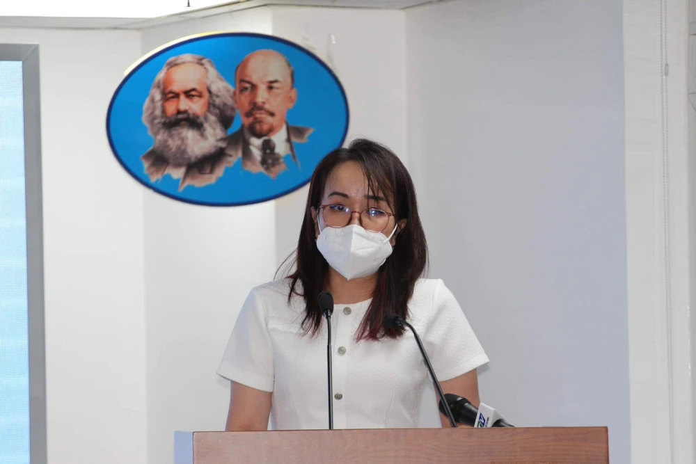 Bà Lê Thiện Quỳnh Như, Phó Chánh Văn phòng Sở Y tế TP.HCM trả lời về vấn đề nhân viên y tế xin nghỉ việc. Ảnh: HL