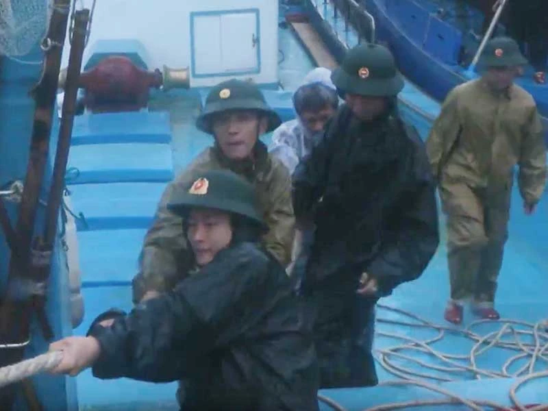 Bộ đội giúp dân chằng cột tàu thuyền.