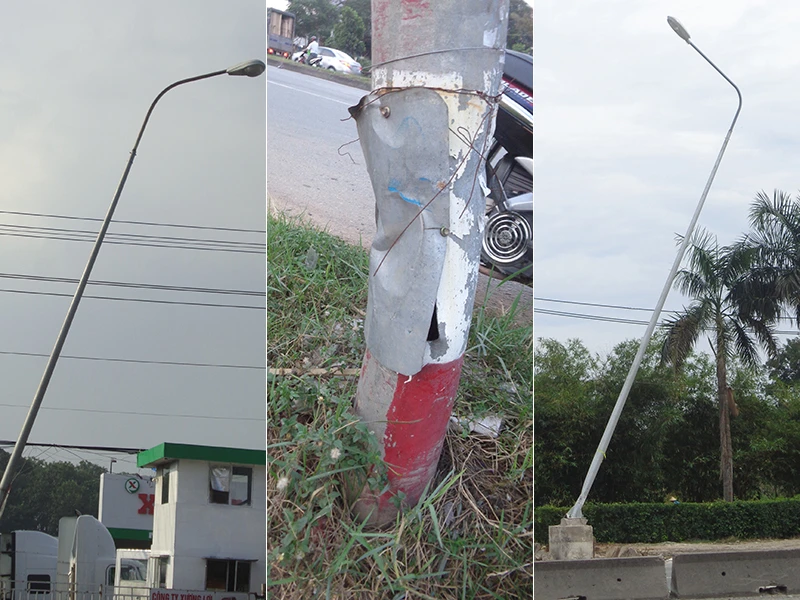 Cả ba trụ đèn do bị ô tô húc vào nên xiêu vẹo, sắp đổ. Xa lộ Hà Nội thường đông đúc xe cộ qua lại. Cả ba trụ có nguy cơ đổ bất cứ lúc nào. Để tránh rủi ro, mong cơ quan chức năng sớm khắc phục.