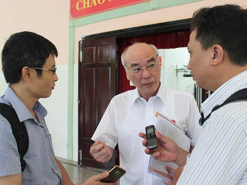 Ông Phan Nguyễn Như Khuê đang trao đổi với báo chí bên lề buổi tiếp xúc cử tri ngày 8-5. Ảnh: CTV