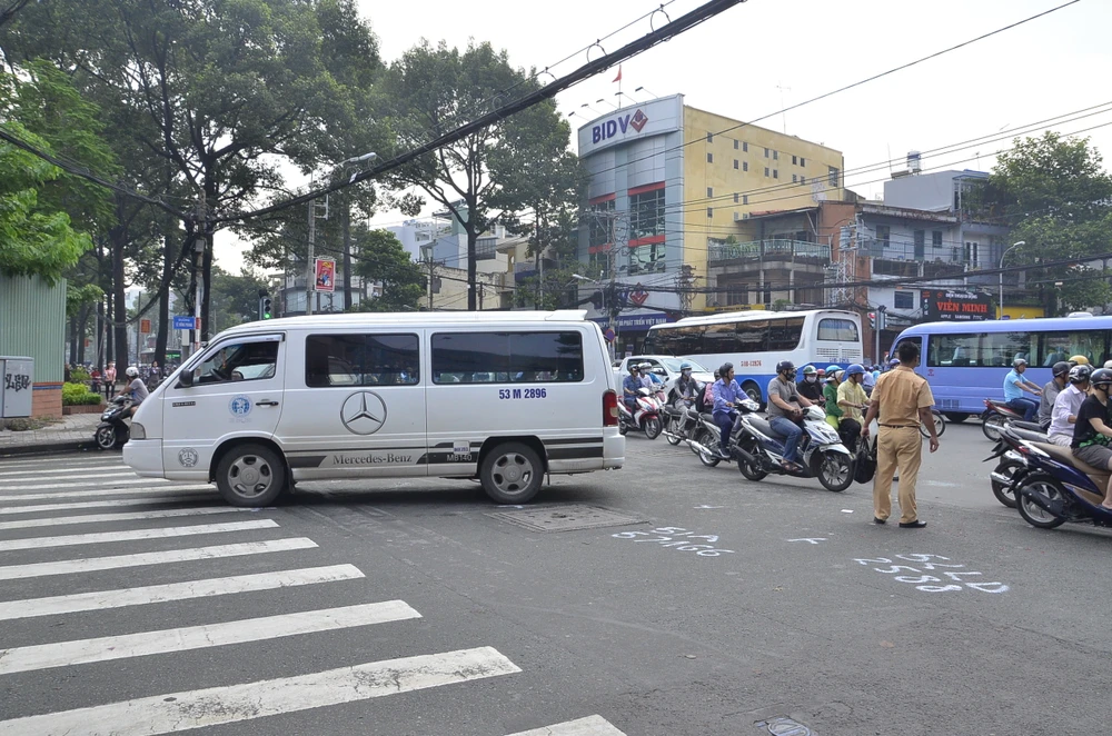 Ba vụ tai nạn liên tiếp xảy ra khiến sáu phương tiện nằm chắn ngang giữa giao lộ, giao thông ùn ứ kéo dài. CSGT quận 10 phải tăng cường lực lượng để điều tiết giao thông, xử lý hiện trường.