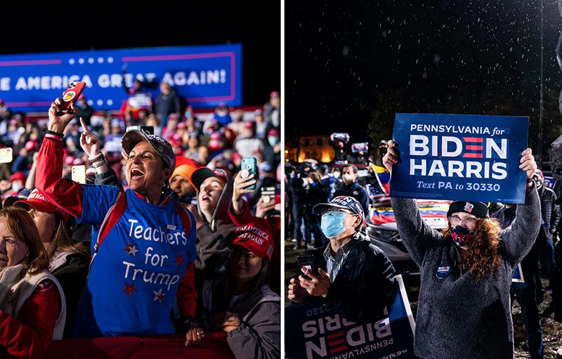Người dân Mỹ ủng hộ ông Trump (trái) và ủng hộ ông Biden (phải) tại các cuộc vận động ngày 1-11 của hai ứng viên. Ảnh: THE NEW YORK TIMES