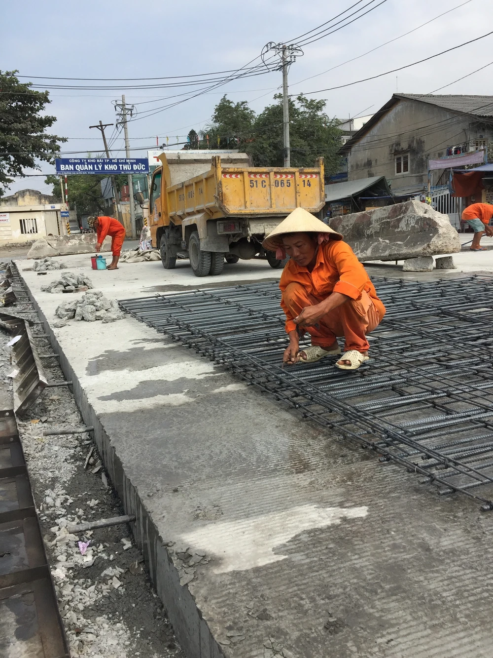 Do có lưu lượng lớn xe tải nặng, xe container lưu thông thường xuyên ra vào các cảng nên mặt đường không được làm theo kiểu nền hạ bên dưới và bên trên đổ bê tông nhựa nóng. Cách làm ở tuyến này là sau khi làm xong nền hạ thì bên trên sẽ có những tấm vỉ cốt thép bằng thép đường kính 14-16 mm và sau đó là đổ lớp bê tông xi măng dày gần 25 cm. Cách làm mặt đường này nhằm hạn chế lực xung kích khi xe dừng, khởi động, hạn chế lún sụt, trồi mặt đường.