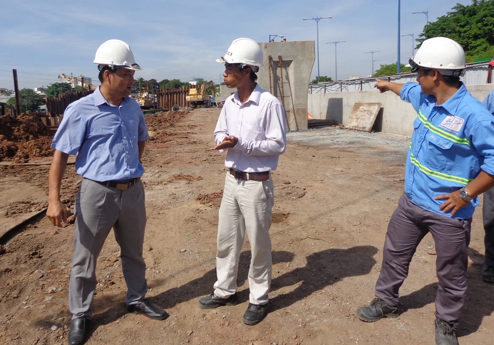 Trên công trường của cả hai nhánh, các cuộc trao đổi, giao ban hằng ngày giữa chủ đầu tư (bên trái) và đơn vị thi công liên tục diễn ra để "gỡ" ngay các vướng mắc, đẩy tiến độ công trình về trước kế hoạch đã định.