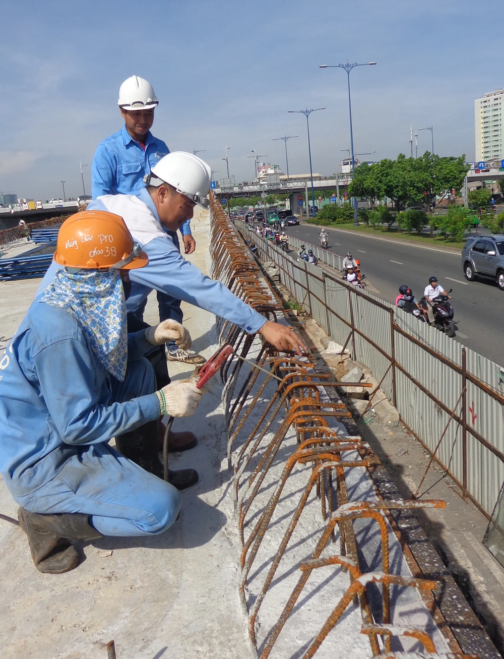 Theo kỹ sư Trần Phương Nghĩa (ở giữa), chỉ huy trưởng thi công nhánh N2, đến nay toàn nhánh này đã đạt 63% khối lượng công việc. Nhánh này dài 140 m, rộng 6,2 m. Trong ảnh, công nhân, kỹ sư làm việc ở nhánh N2 kiểm tra, gia cố, hoàn thiện lan can nhánh cầu.