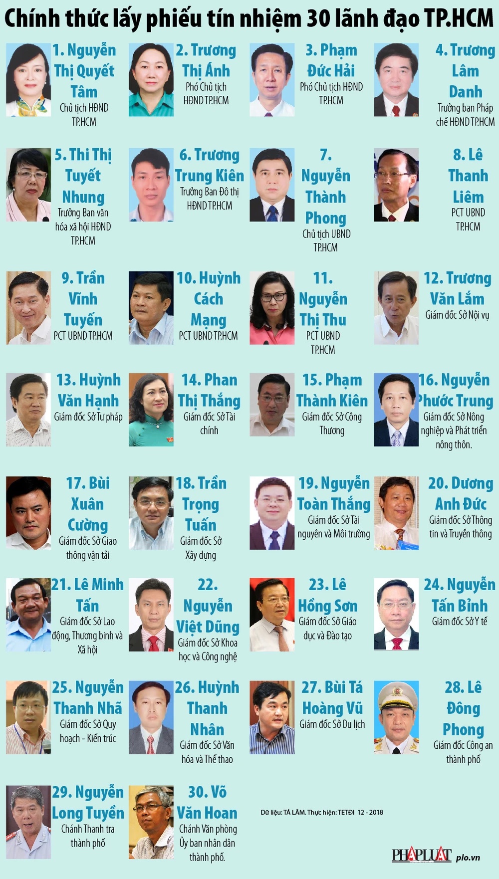 (PLO)- Chiều 4-12-2018, HĐND TP.HCM thống nhất danh sách 30 người chính thức lấy phiếu tín nhiệm kỳ họp thứ 12 HĐND TP.HCM khóa IX như sau.